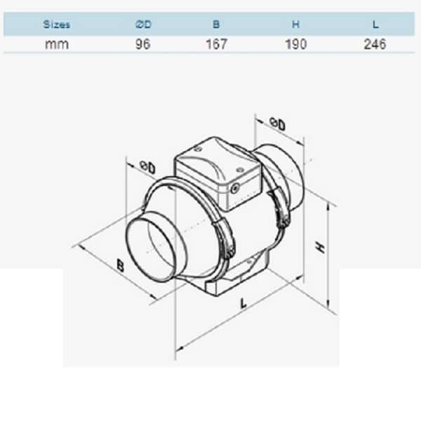 Potencia max. 33 W.Caudal max. 187 m3. / h.Bocas 100 mm.Peso 1.5 kg.Velocidades 2Decibelios 28 dB.