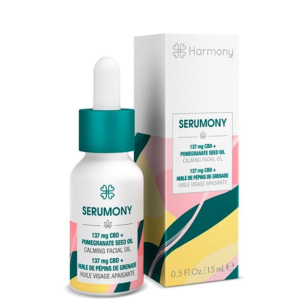 El aceite facial rico en antioxidantes de Harmony, Serumony, contiene una rica concentración de CBD, infundido en una mezcla nutritiva de aceite de semilla de cáñamo, aceite de semilla de granada prensado en frío y aceite de cártamo, para calmar, suavizar y aumentar el brillo natural de la piel. Con solo seis ingredientes esenciales, Serumony es más del 99% natural.